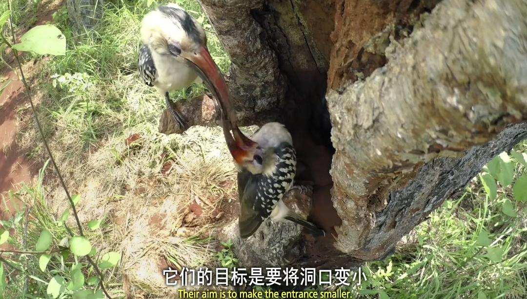 红嘴犀鸟夫妇会为选定的树洞修门,用泥浆把树洞入口填小。