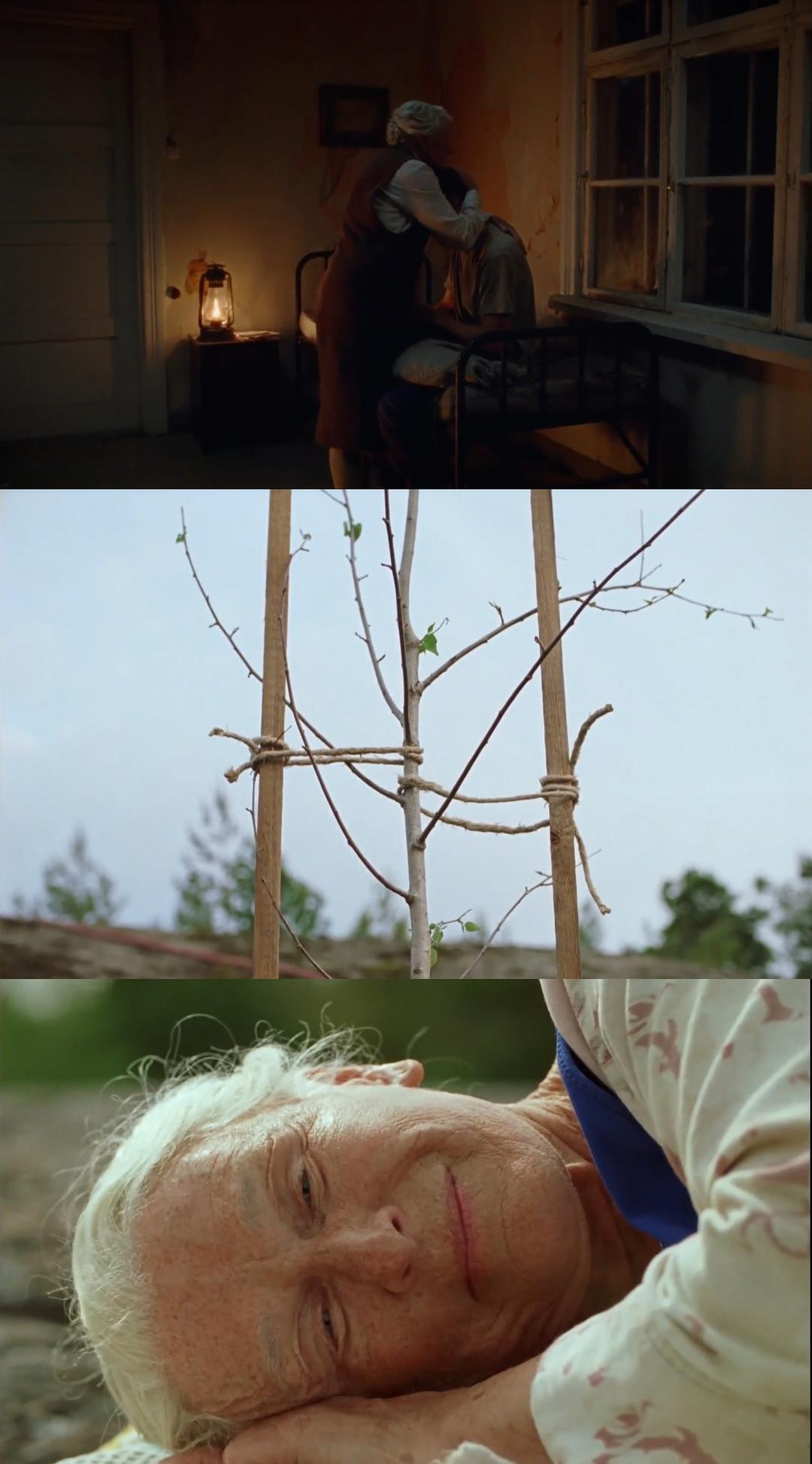 正如许多老派的中国人,芬兰人也从不轻易开口说“爱”,而是通过行动与陪伴传递情感。这一民族性被克洛斯化为精湛的肢体语言:她蹒跚的步态与佝偻的脊背,隐喻着生命与自然的相互驯服。当索菲娅童言无忌地问“祖母何时死亡”时,祖母淡然回应“快了”。这种近乎残酷的直白并非苍凉,而是高寒北欧对生命循环的平静接纳。影片摒弃戏剧化的宣泄,转而以一场突如其来的暴雨作为情感催化——父亲在波涛中的怒吼虽被诟为“生硬”,却道尽了现实中惯于压抑者的偶然失态,让观众得以窥见静默冰山下的暗涌。
