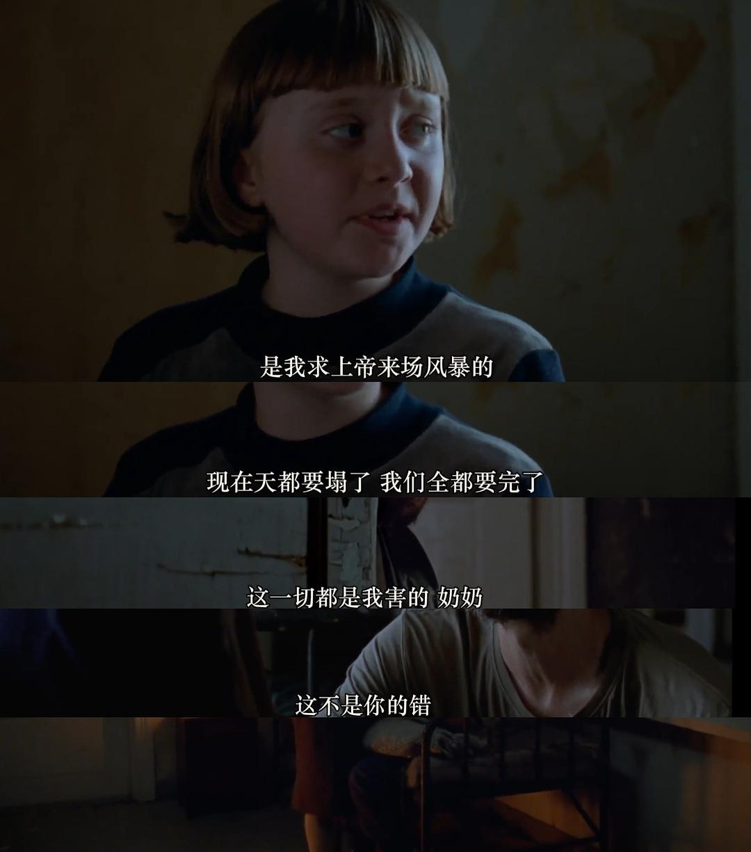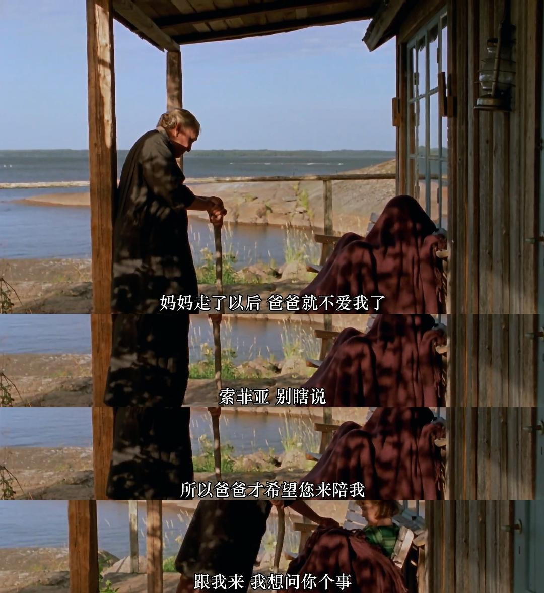 n索菲娅对父亲说:“对不起,是我祈祷暴风雨来临的”;这里面隐含着,索菲娅有可能认为母亲的离去也是她造成的;父亲体谅到了她的心情;对她说,“索菲娅,我早上也祈祷来一场暴风雨了呢;在你还没起床的时候就祈祷了”;这下就相当于父亲接过了责任;他继续对索菲娅说:“你没做错任何事,妈妈也很喜欢暴风雨呢”;这句话彻底解开了索菲娅的心结。孩子放心了,这一夜她睡得很踏实。以至于奶奶醒来都没打扰到她。nn看点2:整部片子淡淡的风格,配乐也比较舒缓,偶尔的一段大提琴让人对索菲娅和爸爸有莫名的心疼。n