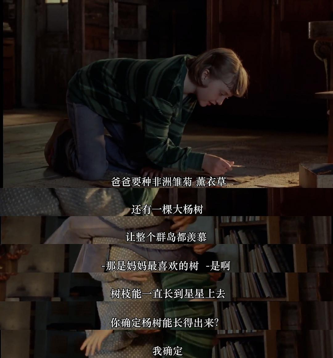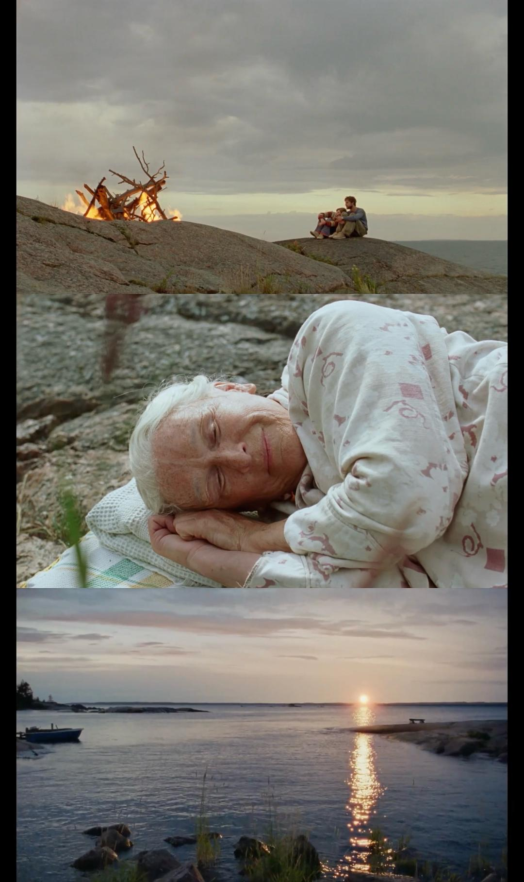 来自芬兰的故事,在美国导演的编排下展示出了别样的温柔和细腻,而当作为中国观众我共情的时刻更让我意识到,跨越文化和地域的感动是故事和影像力量的最大化的展现。不需要任何文化背景交流,我们自然而然的就能感受到故事里三代人的情感。在冰雪消融之后的夏天里,在关于生命的讨论里,在倾听到的鸟叫虫鸣和呼吸拥抱的自然里,我们看到了来自三代人的情感绑定和萦绕在彼此心间的怅然若失。nn母亲的离去也许是三个人都不愿提及也无法面对的伤痛,岛上安静的生活和祖母偶然讲述的回忆似乎又在提示着生命的漫长与终将消逝的结局。我不觉得治愈来自于某一段话或是某一件事,它发生在在岛上的时时刻刻,来自于眼睛看到的一切和感受到的一切。是在水中晒到的太阳,是种下的种子捡起的枝丫,是手触碰到苔藓时熟悉的触感,是丛林探险里的发现,是意外的暴风,是日出日落。我太沉醉于自然风景里的时时刻刻,也太明白其中蕴含的力量。这片土地滋养了祖母和父亲,也让对一切感到陌生偶有无聊之感的女孩慢慢体会到其中所带给她的能量。于是我们共同面对了困难,就能一起解开心结,我们再次面对生死,又有了新的感受和理解。