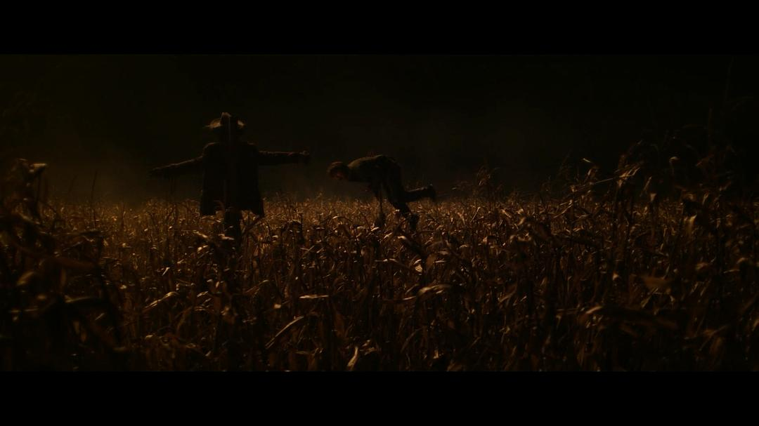 再比如,击倒第一个“弗罗多”之后,镜头一切,是一堆人——一群穿着统一制服、戴着塑料面具、看起来像是工地午休时间出来拉横幅的“弗罗多部队”从玉米地里冲出来。你本来以为要被吓到,结果只能被他们的队形笑到。导演根本不指望你认真——他摆拍的就是一场恶作剧给你看。