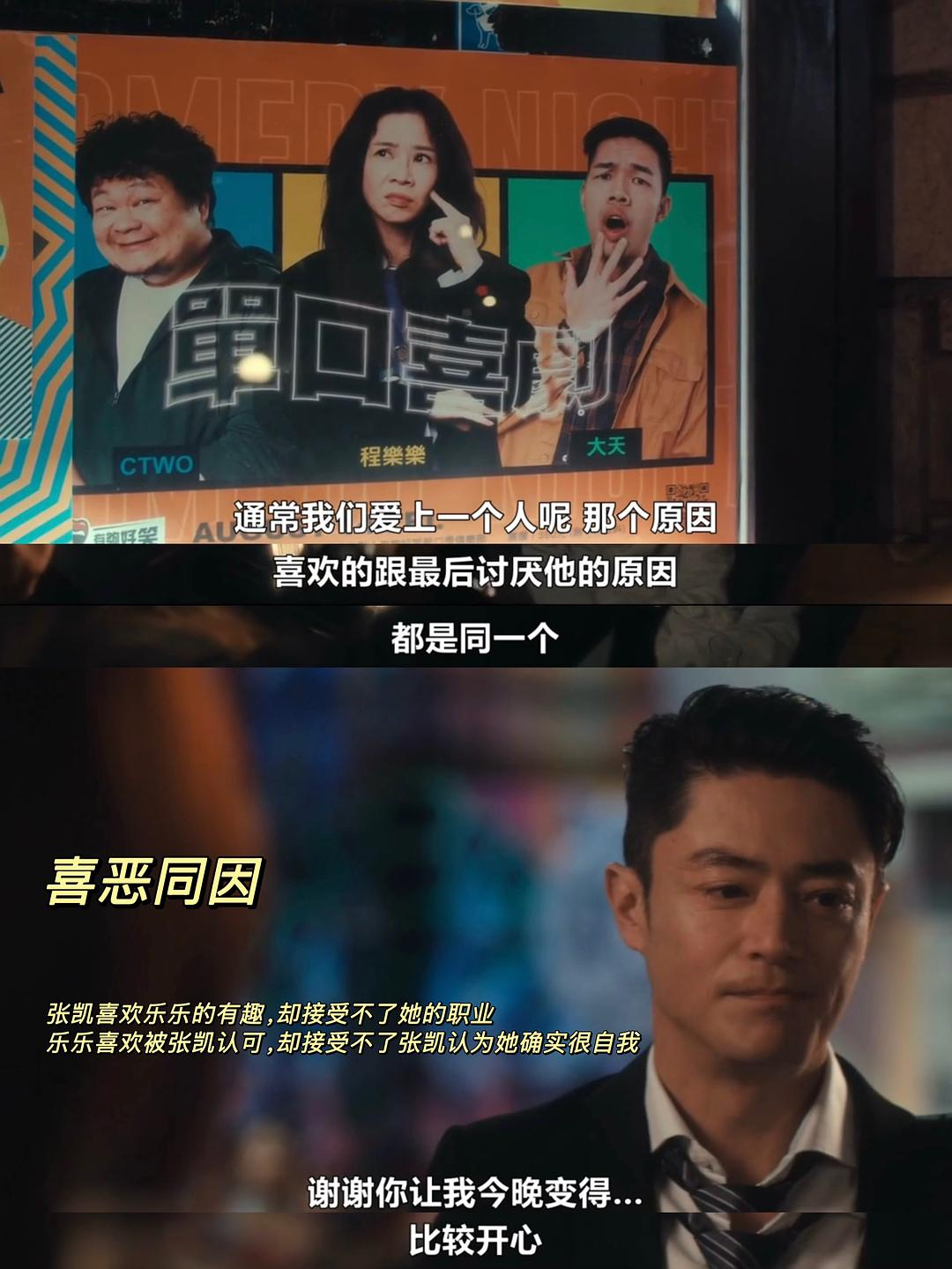乐乐喜欢张凯是因为张在乐第一场脱口秀时给她认同感和反馈,和张凯爆发吵架的那场戏,也是因为张凯对她“认同”方面的评价“你和你爸是同一类人,很自我”。