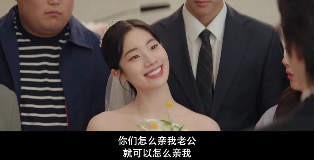 最后在婚礼上,想亲她的人必须得先亲她老公,这个条件是由她提出来的,而不像前三版由丑老公提出。