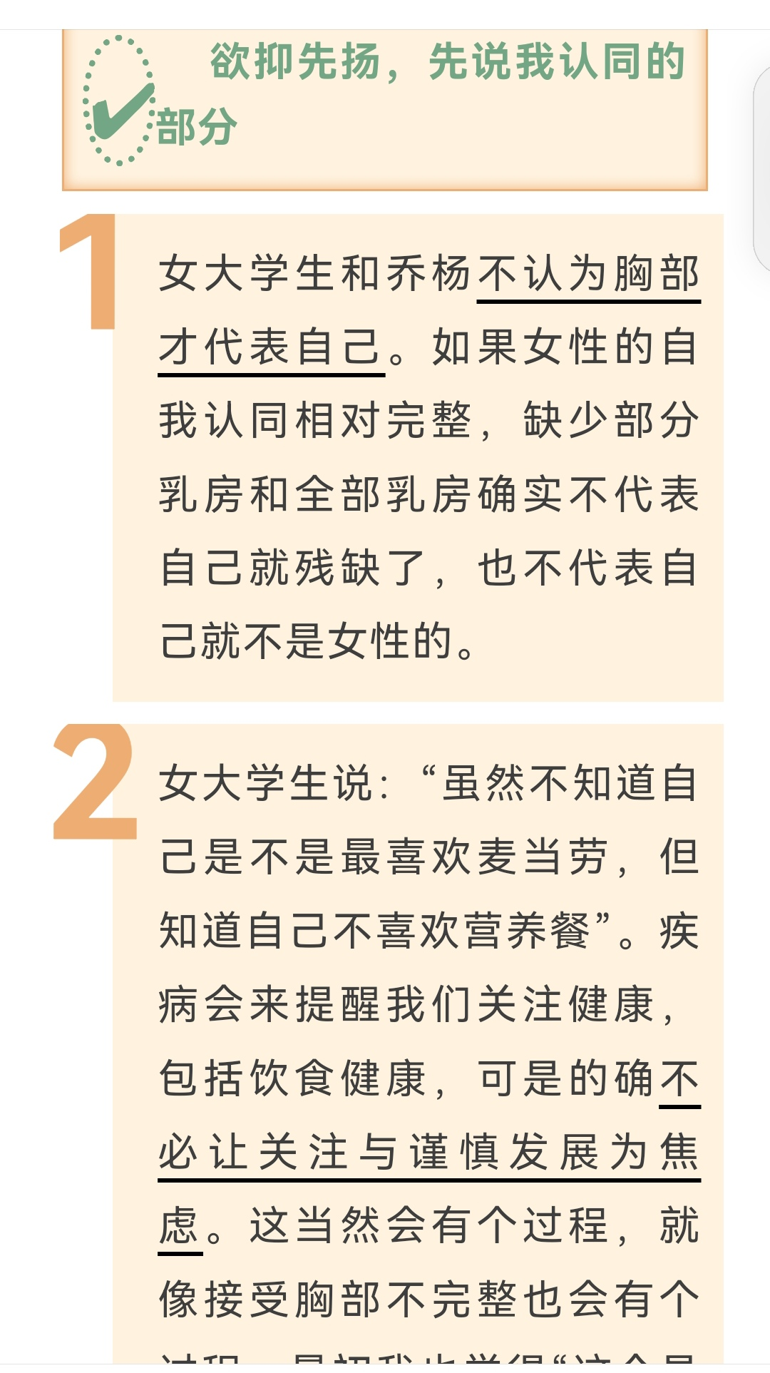 原文说:整体不错,主旨也好,对三个乳腺癌角色的呈现和解读有认同之处,比如女学生不愿做重建手术,不喜欢吃营养餐;也有认为潦草刻板之处,比如乔杨说乳房只有哺乳这一个功能;更有困惑之处,比如为什么这三个角色都看起来像不记得有放化疗这回事,像都是一切了事,而且那么巧全都不需要内分泌治疗,也没听他们谈起手术只是一个环节其实乳腺癌治疗中和治疗后还有很多问题要面对……nn果然是经历过才更立体。nn原文https://mp.weixin.qq.com/s/XA_a8Qs3MVMdtFFTVsP-jQnn