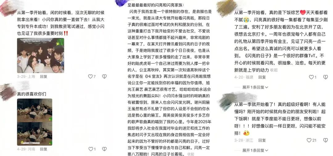 年轻化、喜欢乌托邦群像与情感共鸣、粘性极强,这是《闪亮的日子》的粉丝画像特征。前几季节目招商难,布灵宝们使出浑身解数帮忙拉赞助,去往各大品牌的官博留言私信,“求金主爸爸看到我们小闪”。
