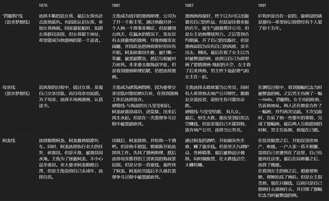 我是以推进主角关键节点的重要人物来命名三条线。“四眼狗"线--在女主不断地鼓励下,他没有放弃漫画梦想,不断的前进,最终一生都在画画。母亲线--因为想让母亲过得更好,决定努力读书,放弃漫画,之后也因为家人过得更好,安稳,选择当公务员,放弃更有风险的另一份工作,直到人生的最后才能开始画漫画,追求自己的梦想。阿龙线--因为选择跟了阿龙,所以一只脚进了黑社会,最终变得所以事情只为自己,无家人,无朋友,看似风光只剩自己。直到母亲的不想见,才让男主醒悟,最后改变为做事情对得起别人,对得起自己。n
