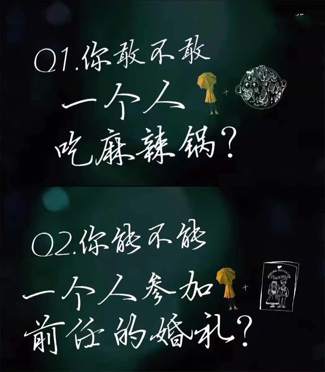 你敢不敢一个人吃火锅?你能不能一个人参加前任的婚礼?你吃过一个人的年夜饭吗?你敢不敢一个人动手术?