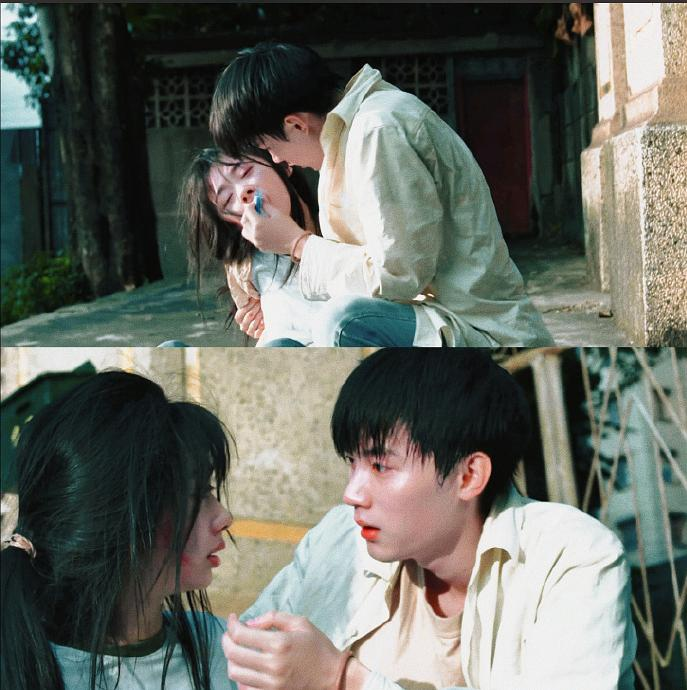 1. 在唐亦寻被暴哥打伤后叶海棠为他处理伤口时,他先是直勾勾的盯着叶海棠,在叶海棠抬头时慌乱的闪躲,到后面又继续紧盯着对方,眼神的三次转变,不需要任何台词或多余的动作就体现了唐亦寻这个时候的三个心理变化,从初生情愫,到青涩害羞,再转变为坚定保护的欲望