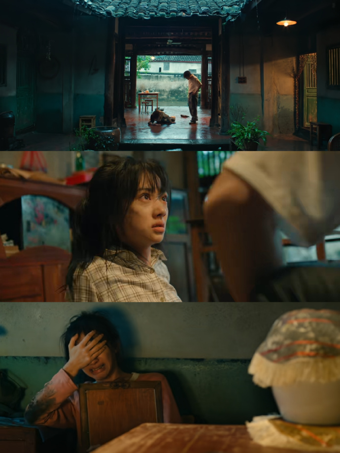 海棠在与叶一波的拉扯过程中,被他爸重重的摔到地上,那失去重心的砰砰砰声,就像一颗颗钻向观众心底的钉子一般刺痛。