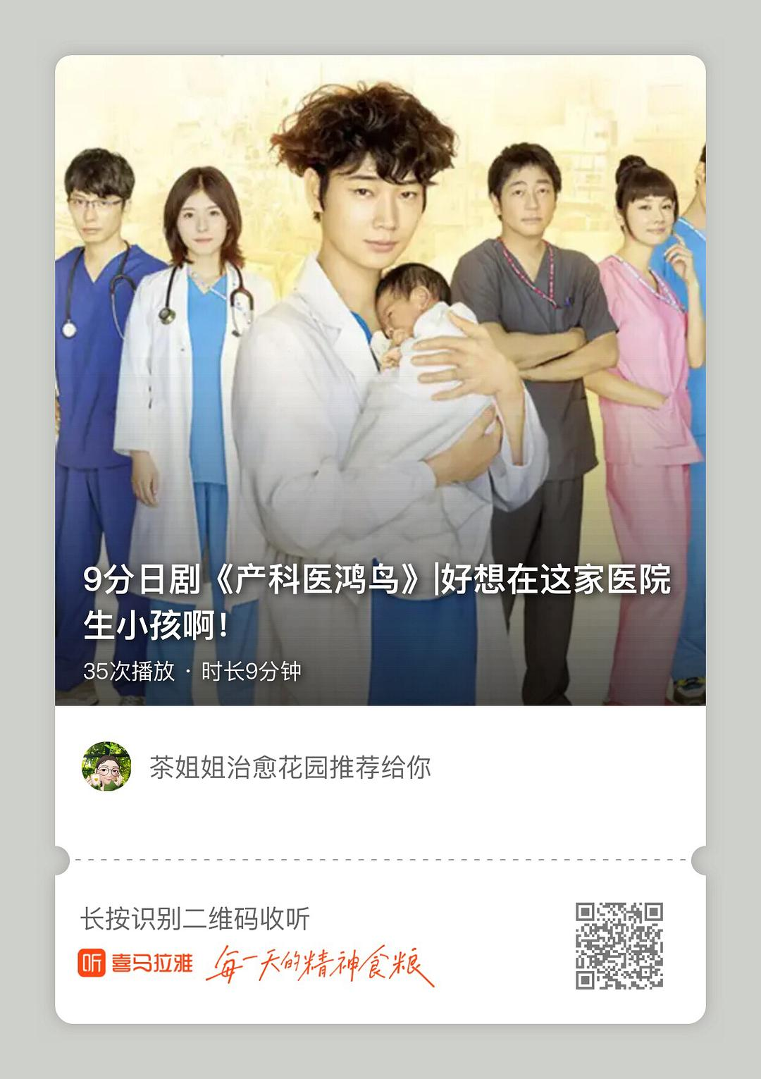 对了,啰嗦一句。还有一集我也有点不舒服,就是那个得了癌症还是拼命要生孩子的母亲,总有种看国内狗血剧的错觉。其实也可以理解,有人就是不惜生命想要一个孩子,这集鸿鸟医生那句“因为我想让您亲手养育他”也很令人感动,成功挽救。但是还是希望其他人和广大女性自己明白,每个人都有选择活下去的权利,不要轻易被“母亲的伟大”道德绑架,“生”只是开始,“育”才是关键。