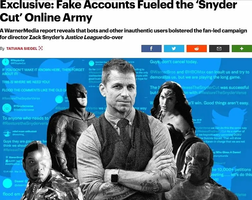 早在2022年7月滚石就报道,正义联盟导剪运动被指受到水军影响,数据注水严重。有调查报告指出,围绕[扎克·施奈德版正义联盟]展开的声势浩大的“释出扎剪版(ReleaseTheSnyderCut)”运动中,有大量虚假互联网账号的参与,这些账号在该运动中放大了某些针对华纳的负面信息。n这场运动中,扎导违规偷走了正义联盟原始素材拷贝,并拒绝了华纳的归还要求。扎导直接将这份原始素材贴上"导剪版214分钟"的标签炒作导剪版存在,这一切貌似是他一开始就计划好的。n华纳高层至少在扎剪版公布后就知道扎剪运动的水分很大了,报告显示推特"恢复扎导宇宙"推文一天有100万,但几天内就降到了可怜的4万,数据不会说谎。