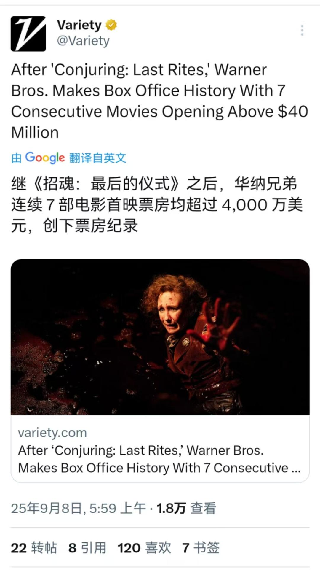 盈利1.25亿美元还没算上流媒体收入,就是纯影院上映盈利。n这也让华纳连续七部电影北美开画超4000万美元,华纳暂时是好莱坞制片厂里面2025年北美总票房第一,17.3亿美元;海外市场总票房第一,20亿美元;全球总票房第一,37.7亿美元。好莱坞发行商里第一个做到连续7部电影北美开画票房超过4000万美元。