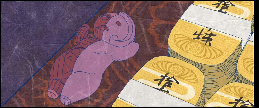 当然全是牡丹,应该也是大友家的家徽,中间一闪了一个下棋的镜头也是很妙,虽然牡丹的房间没有棋盘,但是牡丹也很她爹学习在职场上开始收买势力,对象之一就是被宇歌山器重的朝。