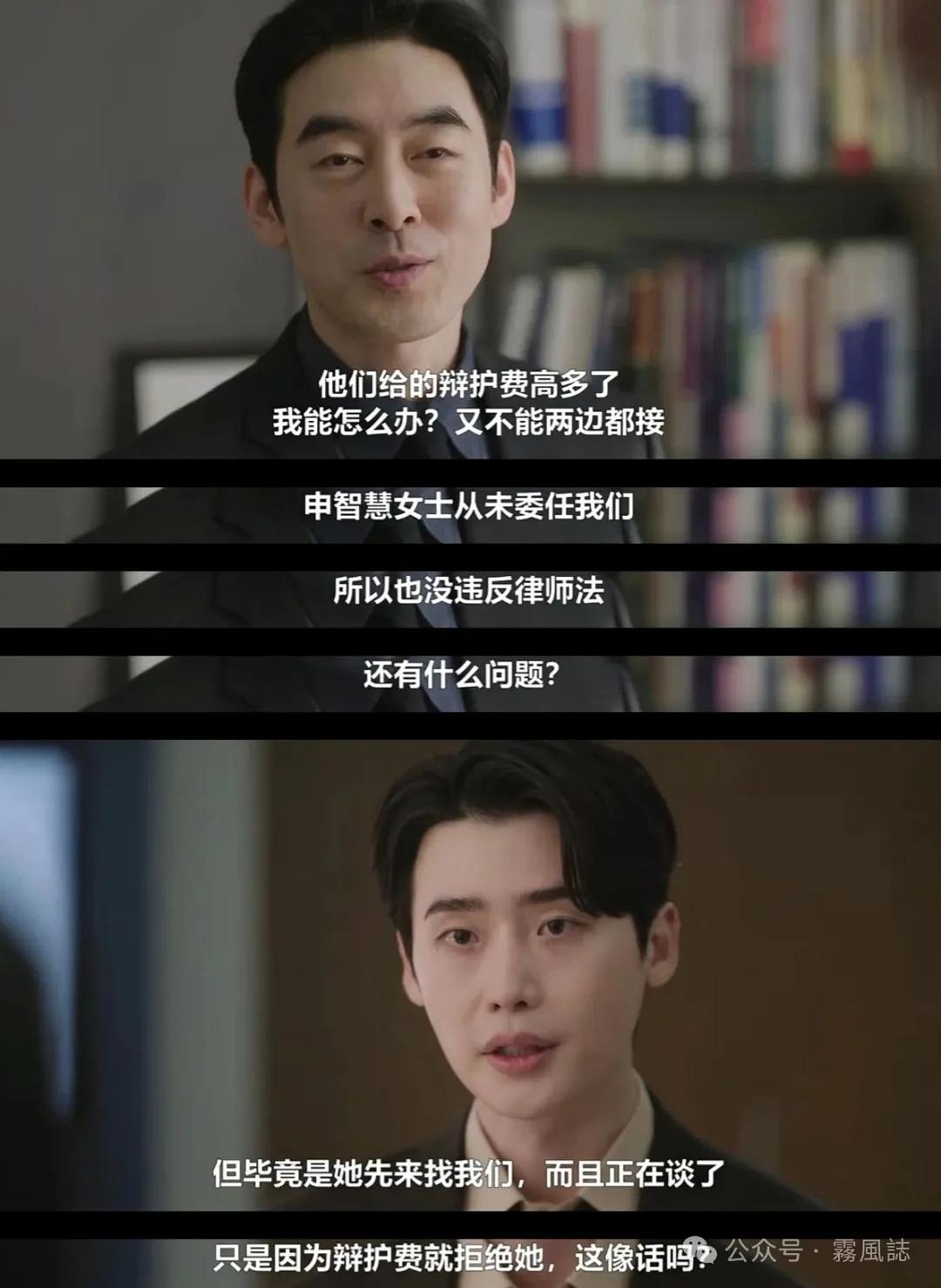 到最新的保险公司案,明明是受害的原告先来的,而上司因为利益问题指派安宙恒去接了被告方的委托。任谁看都是被告的保险公司毫无人性搞职场霸凌,这里也反映出“有钱无罪”现象,有钱无罪并非仅适用于那些有权有势的财阀,体现在这个案子就是保险公司用更多的律师费抢走了原告能选择的最好的律师资源。