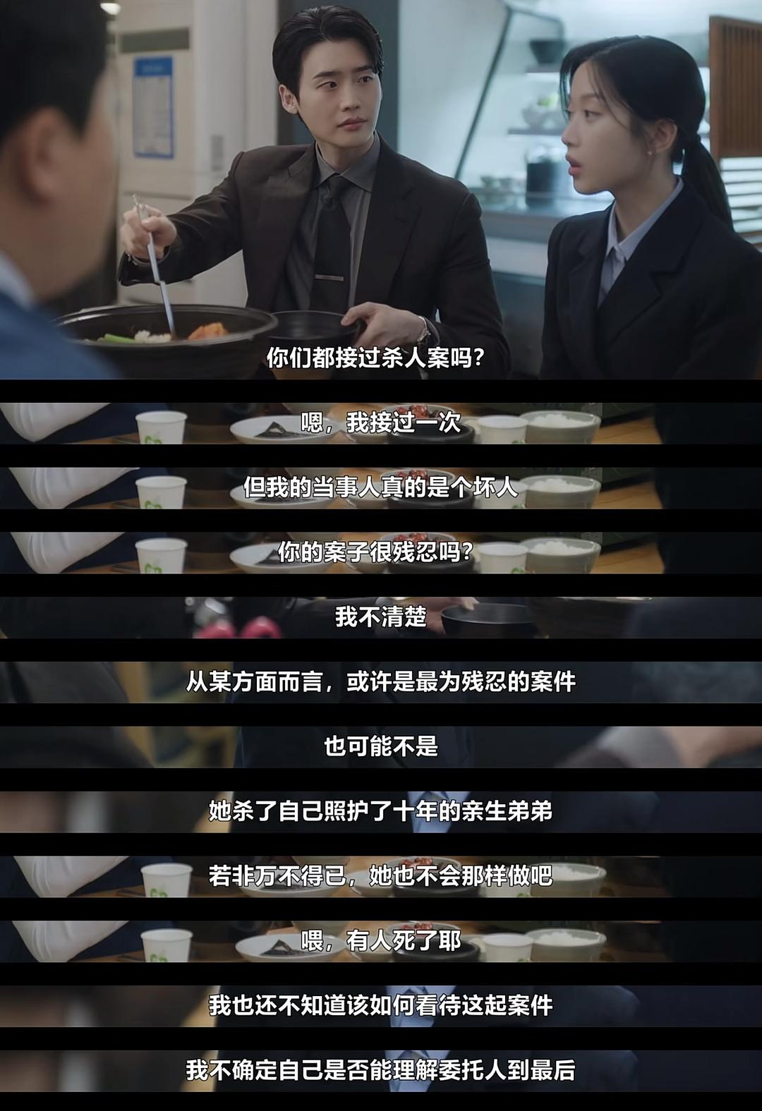 有一说一,他们这身行头,真好看啊!n而且吃吃喝喝的东西都变得好吃很多了呢,欢送会大吃一顿中餐可还行哈哈哈哈哈nnn—nn其实本来就是律师群像,角色多,自然也就案子非常多,仅仅12集的戏忽然就结束了,我只是比较在意第10集而已。ntn仅仅第十集,就塞进去了三个案子,有时候我也觉得韩国编剧是挺辛苦的,想表达的太多太多了。ntn首先是劳务纠纷案,其实一家保险公司的员工难做,大家都是有所耳闻的,因为无法完成业绩而每天无法准时下班,随后抑郁,随后自取灭亡,是痛心的,是所有牛马共同的伤痛,可是这句话刺痛了我,来自亡者的心酸——n但我没想到他竟然辛苦到那种地步,n我还以为…n这种事只会发生在别人身上。