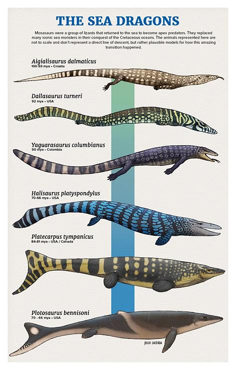 对了,大家应该都知道沧龙并不是恐龙吧?它们和恐龙的亲缘关系很远,甚至不是恐龙、翼龙、伪鳄类所属的主龙类,而是和蜥蜴、蛇同属于鳞龙类。在分类学中,沧龙所代表的是一个超科,即沧龙超科(Mosasauroidea),它们于距今1.01亿年前的白垩纪晚期出现,在白垩纪最后的三千万年里迅速成长为海洋霸主。其中的代表物种包括沧龙科(Mosasauridae)沧龙亚科(Mosasaurinae)的沧龙属(Mosasaurus)和海王龙亚科(Tylosaurinae)的海王龙属(Tylosaurus)。