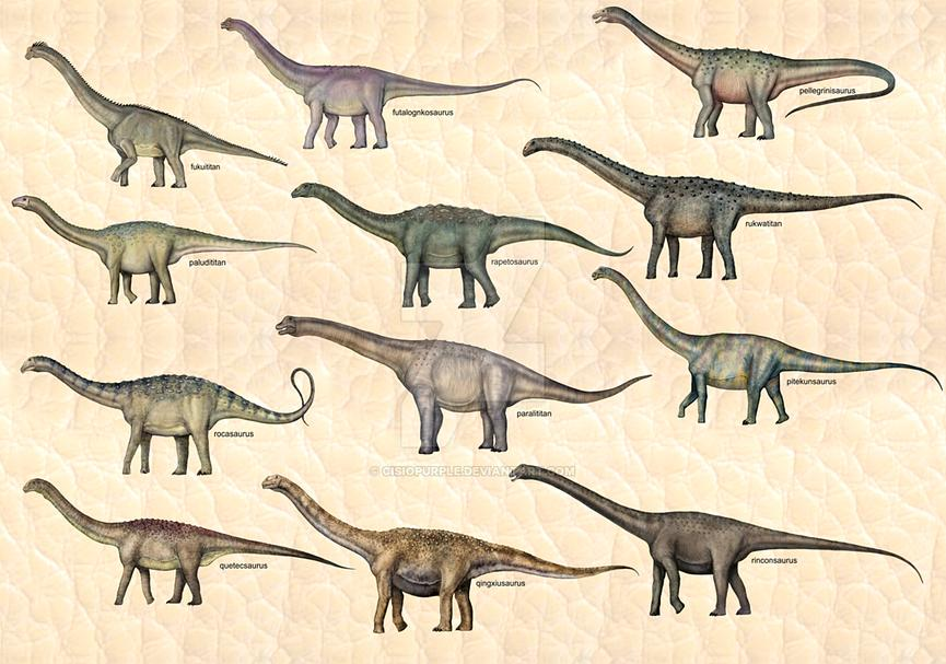 但如果把范围扩大到泰坦巨龙类(Titanosauria)的话,它们的家族就广阔多了。曾经人们认为体型巨大的蜥脚类主要繁盛于侏罗纪时期,到了白垩纪时期,蜥脚类恐龙已经消失匿迹了。但泰坦巨龙类的发现彻底改变了这种认知,整个泰坦巨龙类家族生存于距今1.25亿年前到6600万年前,它们成功取代了梁龙科与腕龙科等其他蜥脚类恐龙,是白垩纪的优势大型植食性恐龙。