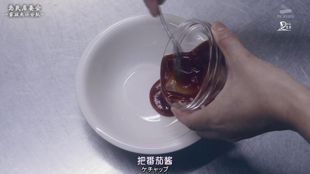 F在味噌汤里加入番茄酱。