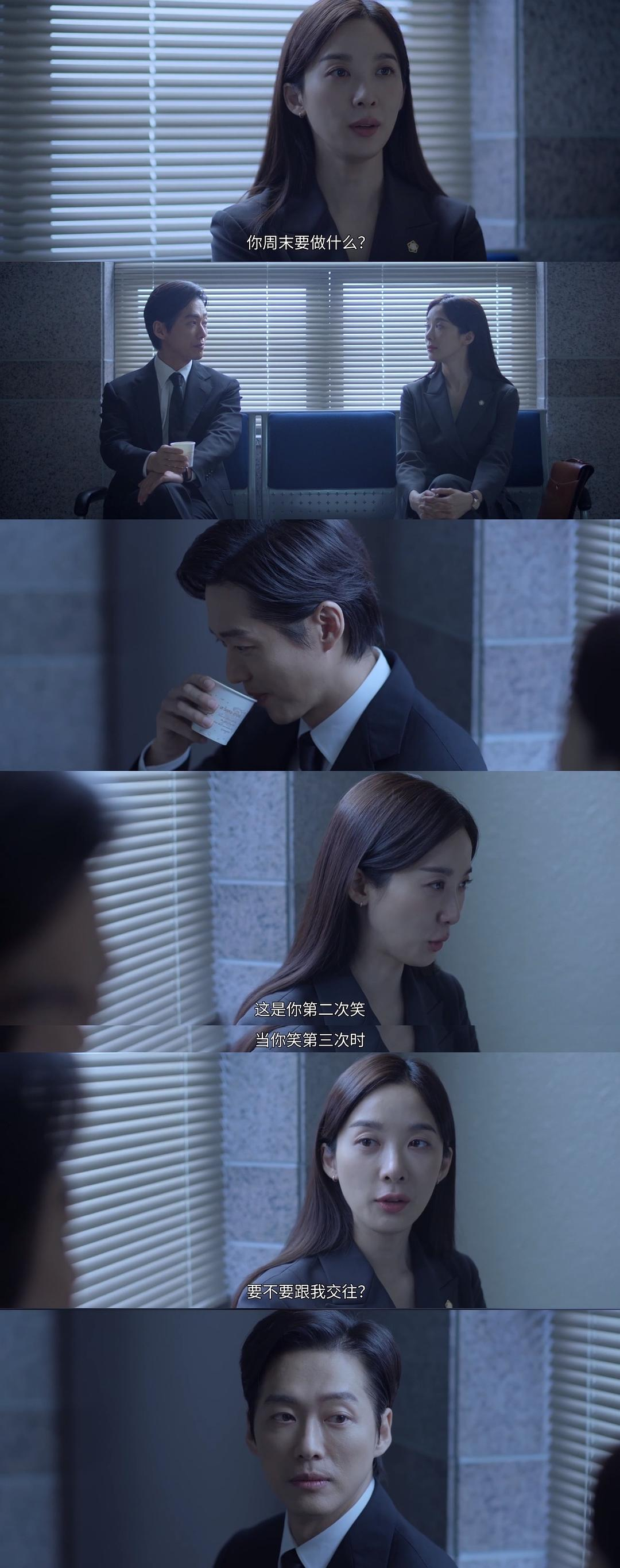 案件进展阻碍重重,又在法院咖啡贩卖机相遇的两人,周英请智勋喝咖啡,问他周末要干嘛,智勋一时愣住,回答似是非是,周英揶揄他是不是只会说“嗯”、“什么”这样的话,智勋低头喝了一口咖啡,笑着说不是,周英又看到他笑了。