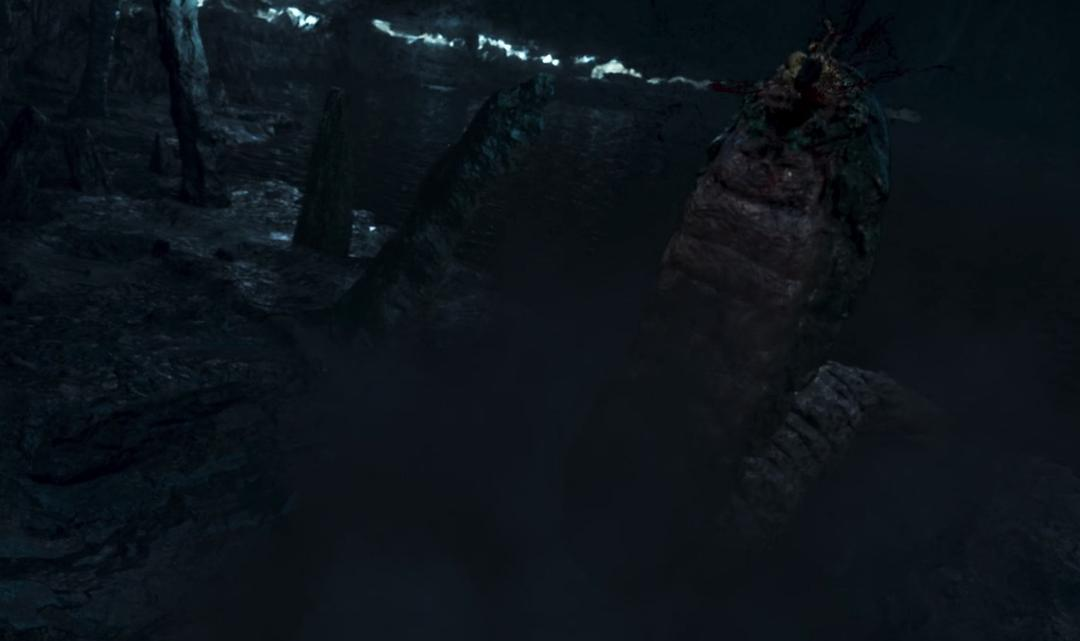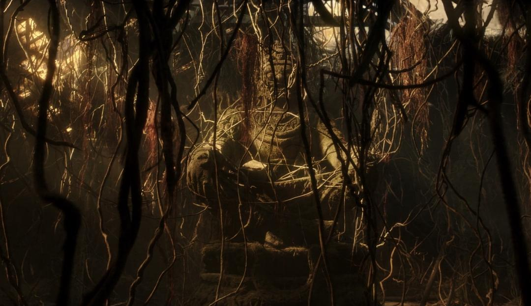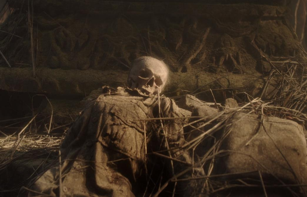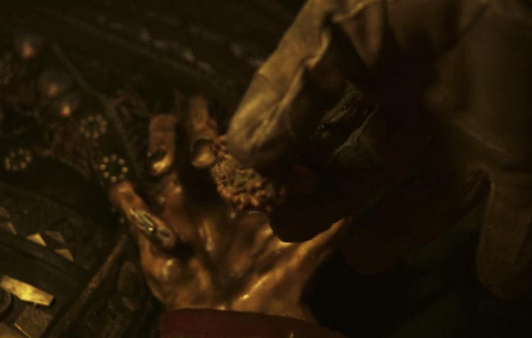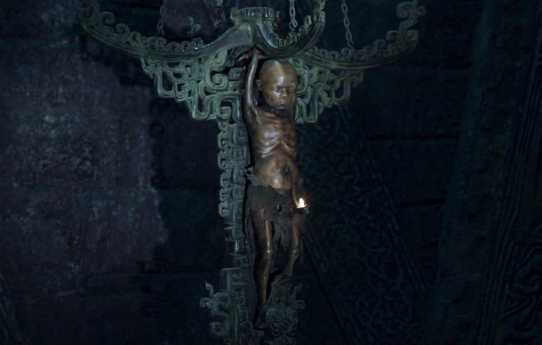6.大祭司下半身被替换成蛇身,蛇身上的血线与棺材外的夫妻树相连,使夫妻树成为了吸血树,树身之内除了棺材还有许多被吸成干尸的动物尸体。