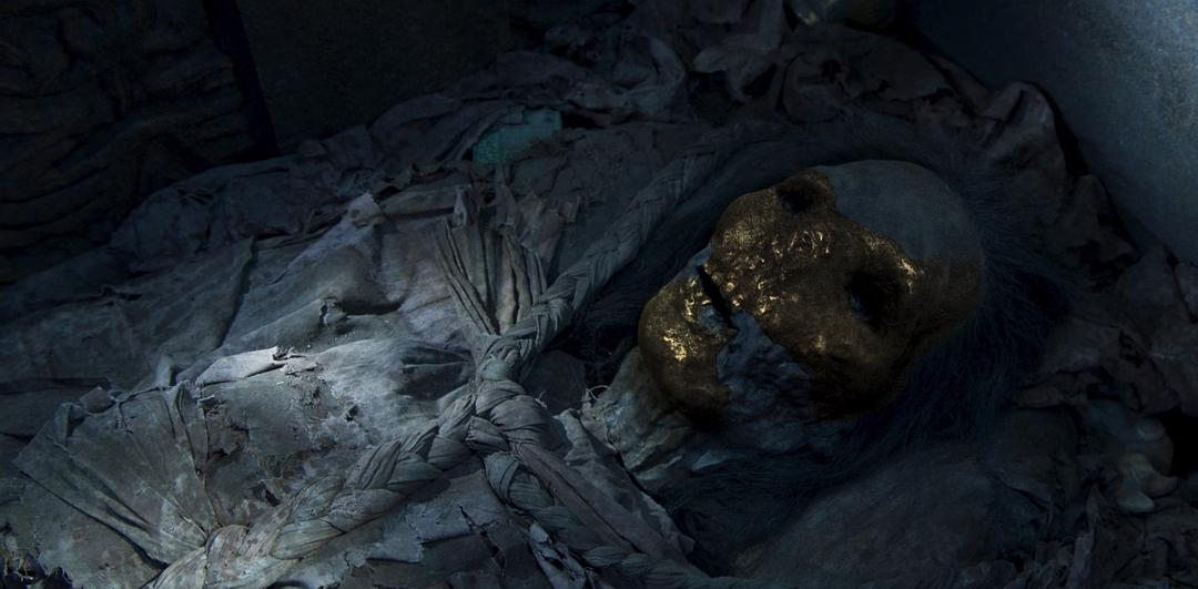 在被狼群逼退的敌特徐干事的挟持下,胡八一下了古墓,达普妖虫发出鬼气逼人的蓝色火焰。借着手电筒看到了墓室的墓床,墓床是雕刻的一头趴伏的巨狼,上面有一具奇怪的戴着面具的尸体,穿着奇怪的衣服,木创下也端坐着一具短小的小孩尸体,同样戴着面具。