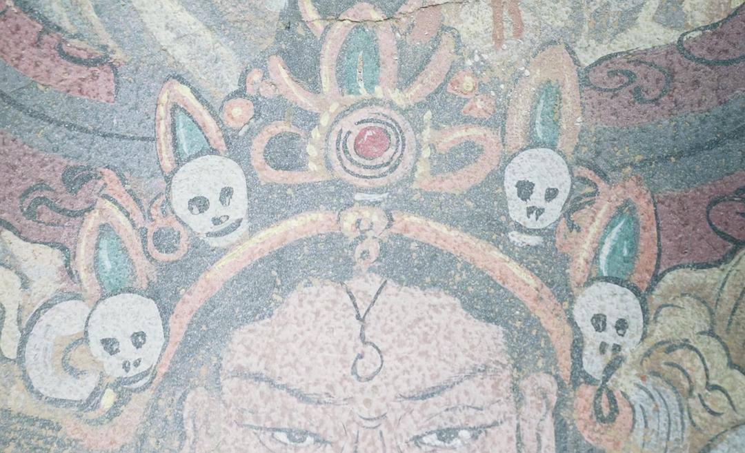 一位裸妇,三目六臂,全身戴满了奇怪的饰品,这些饰物造型扭曲,似乎都与蛇神有关,身旁摆放着一个巨大的水钵,钵体上有蝉翼纹,钵中歪坐着一个又黑又胖的小孩,同样也是三目六臂,手持蛇形短杖,敲击着钵身,图中的背景,是无数堆积成山的牛头骨。