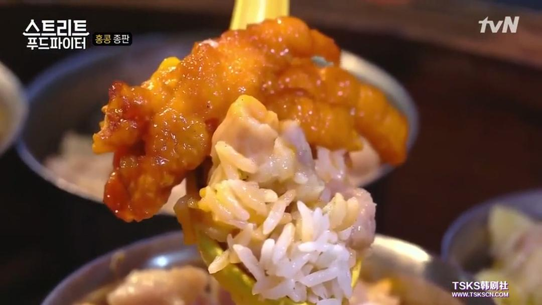 8、富记美食:三种口味的盅饭分别为:土鱿肉饼饭(字幕写猪肉末)、腊味饭(港式香肠)、凤爪排骨饭,还有烧卖。