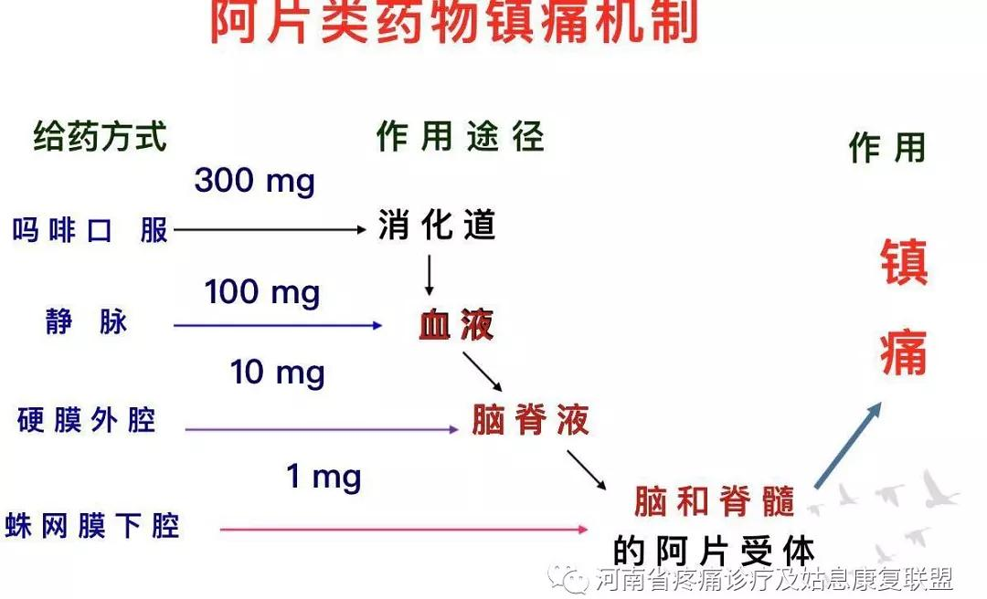 我们知道,椎管通过外面的骨性结构和里面的脑脊液一起,保护着脊髓不受伤害。而脑脊液是循环的,和大脑相通。我们通过一种特殊的途径:腰穿(就是剖宫产做麻醉时的那种穿刺,创伤非常小),然后把1mg吗啡注射到脑脊液里面,然后通过脑脊液循环作用到大脑和脊髓的吗啡受体,就可以达到口服300mg的效果了。这道理,就类似于咱河南省的考生每300个才能有一个考生通过高考直接考上清华北大等985高校,可是某个优秀考生,可以不用考试,而是通过保送或者其他特殊途径,绕过高考,直接进入清华北大是一个道理。这个特殊途径,就类似于癌痛患者的鞘内置管镇痛。