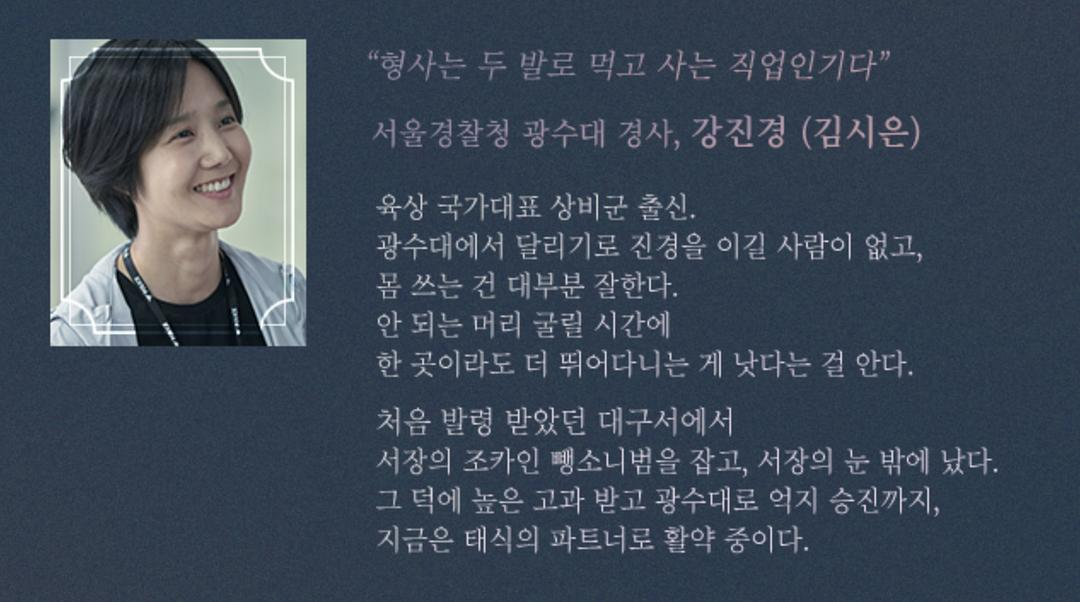 【男刑警】n还有男刑警这个角色,脑子好使,在JQ集团上过班,没有什么理由不来这个组里办这个案子,这也是赵泰植为什么选他的原因之一。