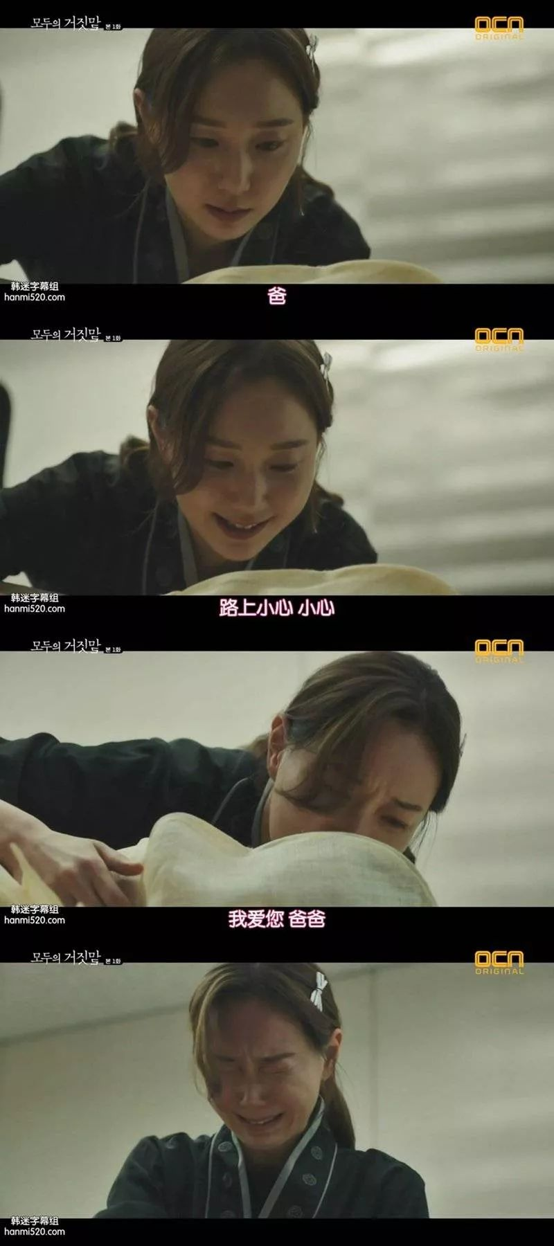 当身处之地【全是谎言】的时候,会花多久「识别出这是个谎」,然后判断出该如何拆破谎言,如何选择正确的现实。n我不知道如果是自己的话,需要多久的时间,也不知道会不会比剧里的人做得更好,但我相信每一个【当下的反应】都是当时能做到的【最好】。n比如,如下图这一镜,从爸爸的悼念仪式上收到疑似自己丈夫戴着婚戒的左手,坚信即便如此他也还会活着。如此来到法医身旁,得来的却是“就是你老公,没错了”,她该有什么反应?像她公公一样血压升高晕过去吗?还是像她妈妈一样直接被吓跑?如果是你呢?你会是怎样的反应呢?n她哭,她怨,但!她要赢的这场战争。n我觉得是符合这部剧的主题的:有谎言就去拆穿它,无论要付出什么!就像她老公愿意付出生命一样,她愿意冒着付出老公生命的危险,一试。