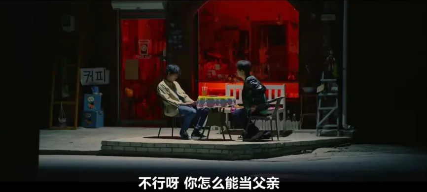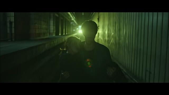 绿色与红色搭配,更显恐怖。下图是女主具凛被绑架,男主来营救她,与反派搏斗的戏。利用后车灯的红光,与停车场阴森的绿光,制造危险、恐惧的氛围。