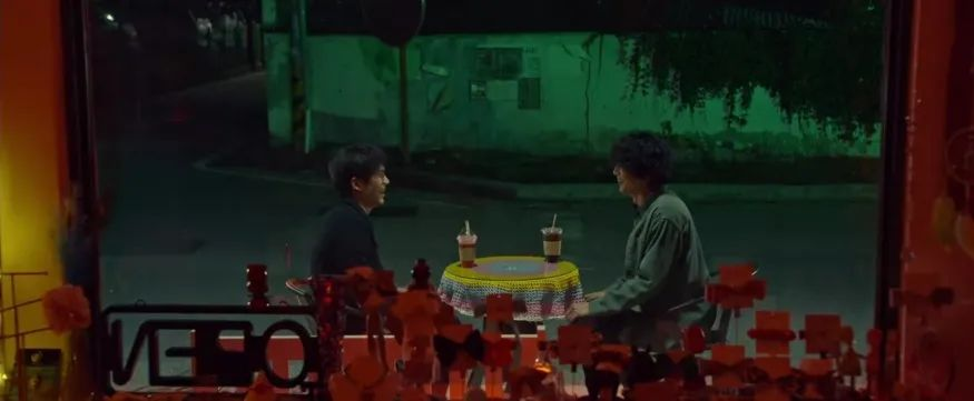 目前更新的第8集中,有2场戏,是同一个场面的不同角度,醒目的红色橱窗,与从橱窗内向外拍摄的绿色街道。