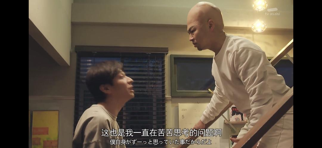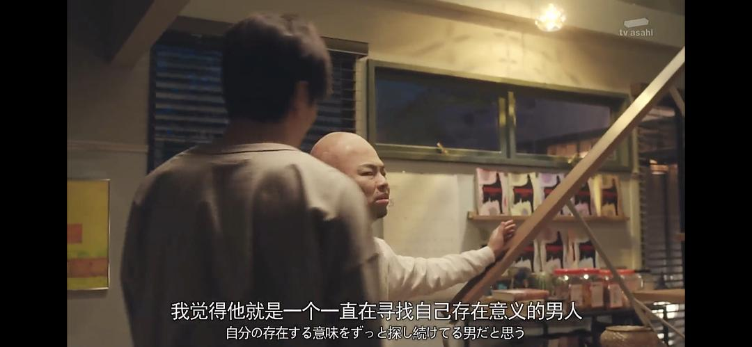 然后心魔就出来了,一个光溜溜的光头男人——幻觉式的意识流人物出来的。日剧就能有这种氛围,出现这种中二的心魔,表情夸张,也没有打破片子的信念感,反而将主人公的内心世界,原先需要用os(内心独白)这种形式的台词呈现的内容,直接演绎成可以看到的视觉化形象,简直不要太形象。