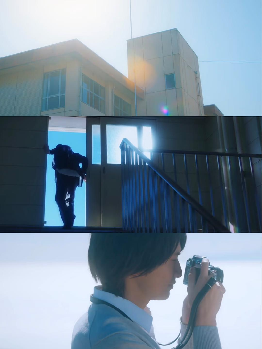 绀野从小相机不离手,在遇到早川之前,他只拍景物,不拍人像。镜头下的景物是相对静止的、可控的,人物的情绪却时时刻刻都在发生变化。只拍景物,意味着绀野更熟悉的是稳定、可预测的拍摄对象,这与他拥有清晰的自我认知和未来目标的特质一致。绀野第一次拍下的人像,是逃往天台以获得喘息的早川,是到达安全空间能够自由哼歌的早川,是卸下面具、做回自己的早川,这样充满动态情绪的早川与他所熟悉拍摄对象完全不同。