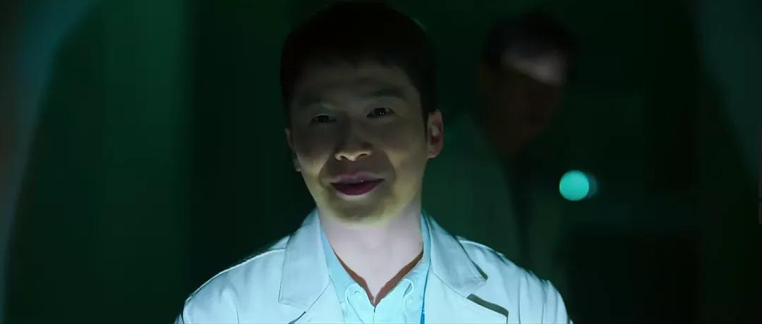 前面他们被保安发现时,这个光是恐怖片常用的打光方式,下方的光源让他的脸看起来十分阴森,这里可能暗示着这个人可能有秘密。