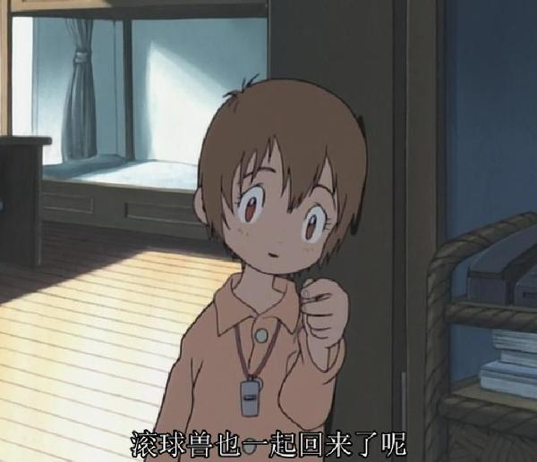 而从未去过数码宝贝世界的妹妹嘉儿对于滚球兽居然毫不陌生。这句话简直让第一次看的小伙伴们有点惊悚,为什么这个现实世界的小萝莉看到数码宝贝丝毫不吃惊,居然还认识滚球兽?实际上这里是提前铺垫了之后的剧情以及同为畑田守导演的剧场版内容,被选召的孩子们其实更小的时候都曾亲眼见过数码宝贝,而滚球兽当年也曾来过太一家中。嘉儿还记得此事,所以他也是其中之一,而太一自己却早已模糊了这段记忆,把它封存进了潜意识的梦境中。