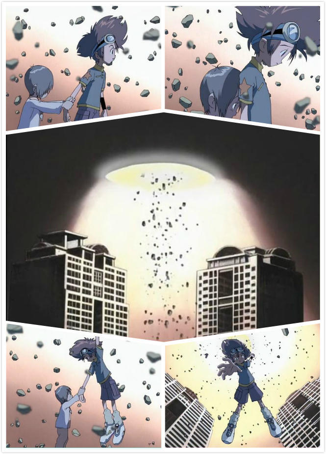此时无意间接到妈妈的电话,终于听到亲人声音的太一差点感动得崩溃。他慌乱地挂掉电话,无法回避地思考着现状与处境。显然他动摇了,而这种想法对于一个小学生来说是很真实的。观光旅游式的冒险已经结束,自己已经认识到了那个世界的危险与残酷。一边是有父母庇佑的家,大人们都无法察觉数码宝贝存在的现实社会。另一边是则是未知的挑战,而他以及知道了在那边如果发生意外,在真实世界中也会死掉,永远回不来了。