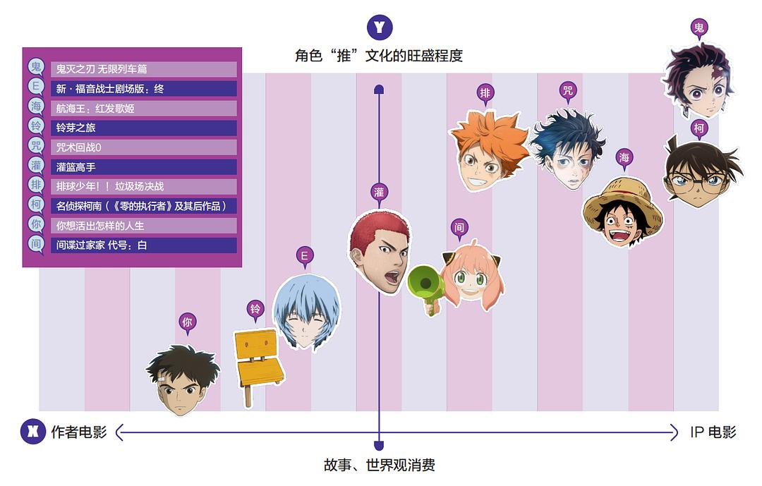首先,坐标上没有一个电影位于 X 轴的极端,再重视 IP 规划总体性的作品,比如《鬼灭之刃》《名侦探柯南》都有一个漫画原作者,只是这个作者已经成为整个资本运作的一员,作者之于作品的不可替代性相对不那么突出,更多的是作者参与其中的制作委员会和动画制作组发挥了一个整体的作用。《鬼灭之刃》在这当中受众年龄层又最广,上至六十岁老人,下至幼儿,所以笔者把它放在了最右上角的位置。
