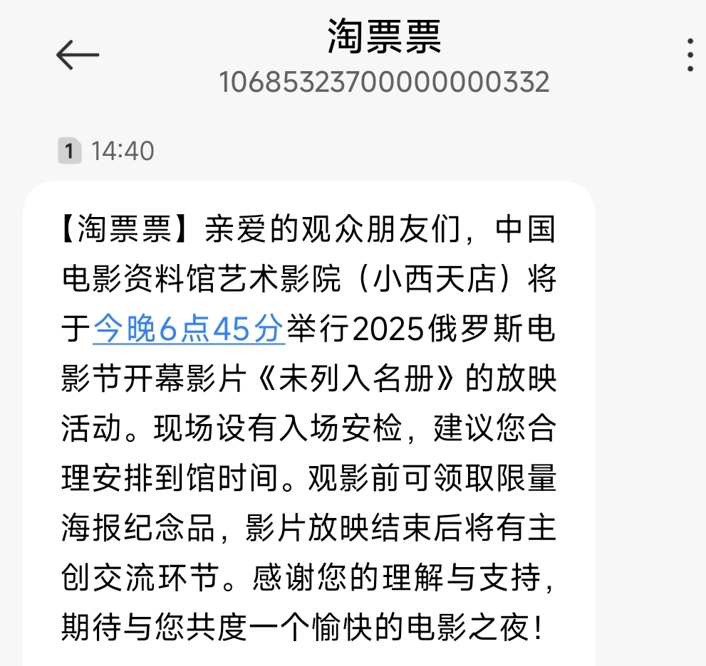 2025年9月1日小西天观影,其实并没有什么观影计划的,只是刚好有时间所以买了票来看看。后来发现还是俄罗斯电影展的开幕电影。nn当天还收到小西天短信提醒:兄弟们,6:45就来啊,提前15分钟,因为有开幕式!哥们当真了就按时到了,入口处还挺热闹,易拉宝和俄罗斯人都很多。