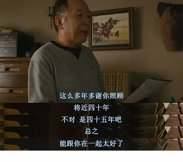 试想一下,如果夫妻两人近50年来都是这样过来的,一朝爆发,也算在情理之中。nn另一个原因,是老太太去文化中心参加了一个小说社,开始学写小说,而且是言情小说,讲述少女春心萌动的那种。nn来感受一下老女文青的文笔:nn一个雨声淅沥的夜晚,真知子为丈夫举行了守夜仪式,真知子从长年累月的看护中解放,她坐在丧主席上,似乎松了一口气,同时又陷入了深思......nn更重要的是,她也在这个社团里面得到了对自己价值的认可。