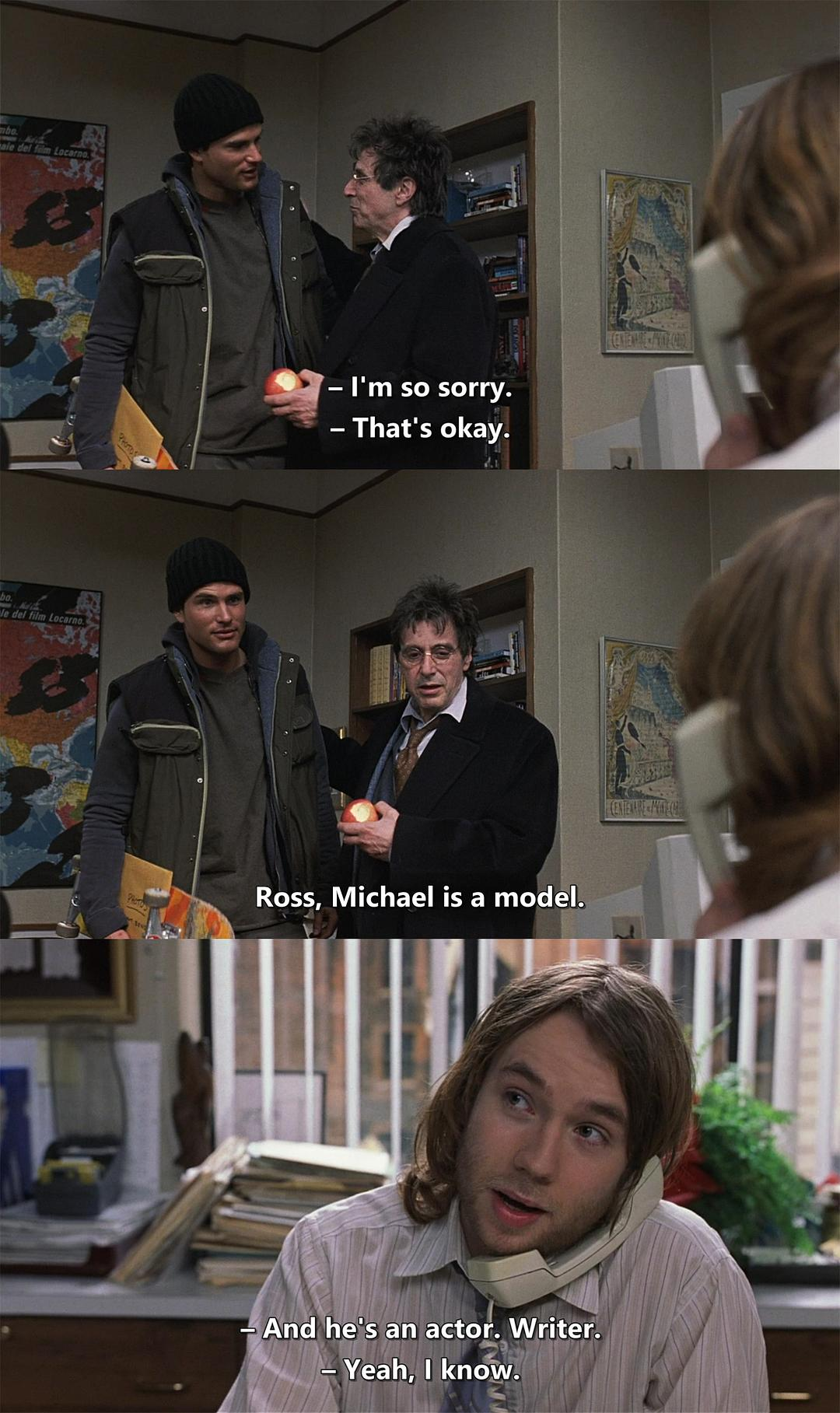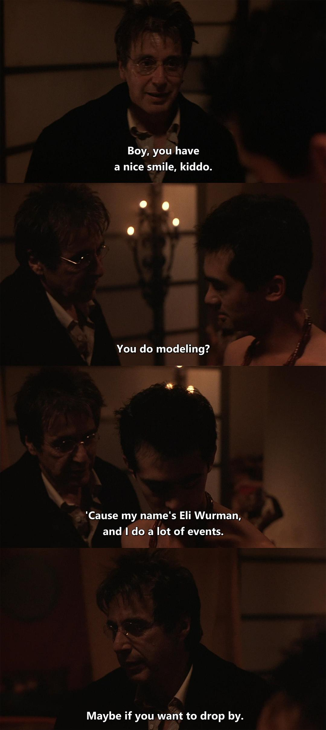 People I Know 里帕演的主角Eli Wurman就是个Gay嘛 (这个电影中文名翻得挺传神的)。美丽的女主数次表白他装蒜不说(嗯,理由很正当,毕竟是他的sister in law);见到个清秀小男生就马上邀请人家去当model(呵呵,掌握一定权势的老男人这点做得不要太明显),而且他的助理也是年轻小男生,影片数处细节透露他招揽小男宠差不多是惯例了;形容一个比较脏乱的屋子像vagina,更是典型厌女基佬的作风PS:当然,下场悲惨的渣男好看是真的好看的