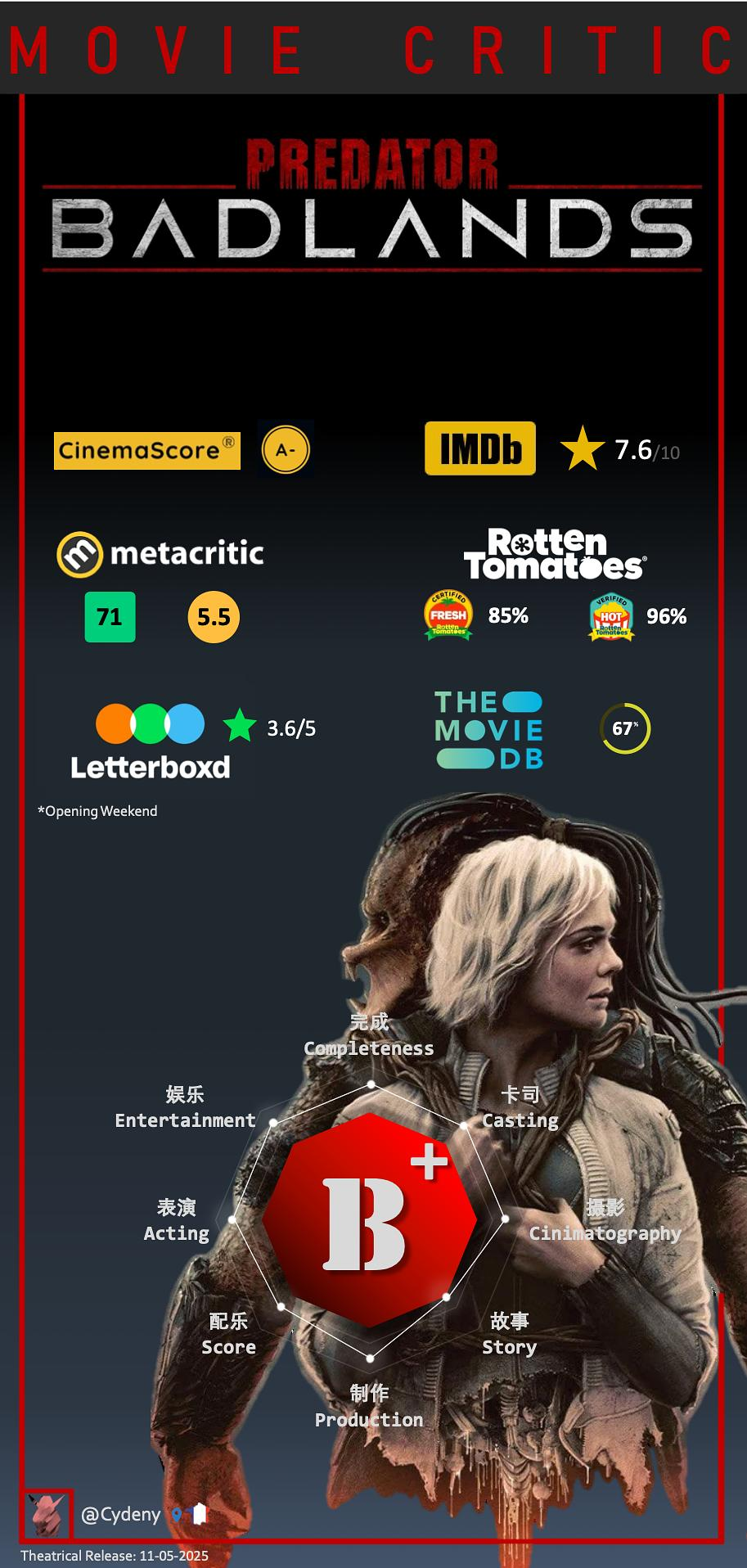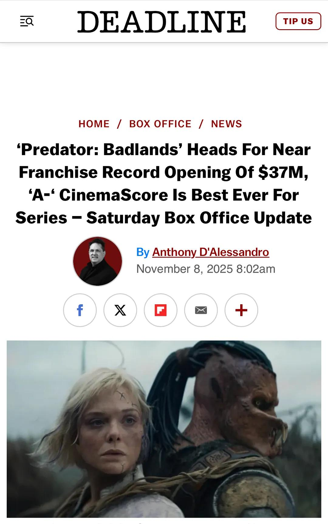 2025年11月,《铁血战士:杀戮之地》正式上映,首周末4000万美元票房打破系列38年纪录。中国票房目前预测是过亿。