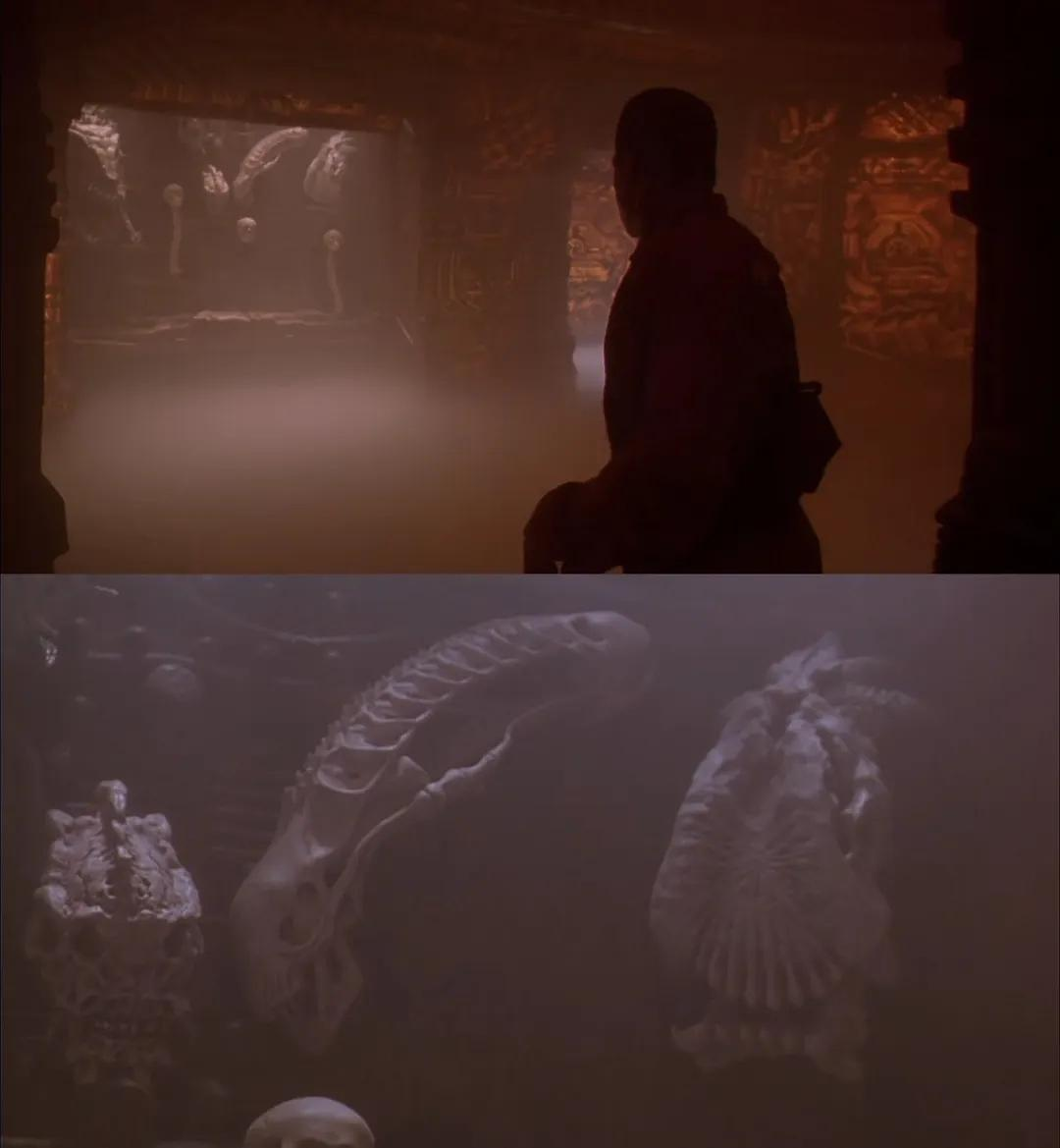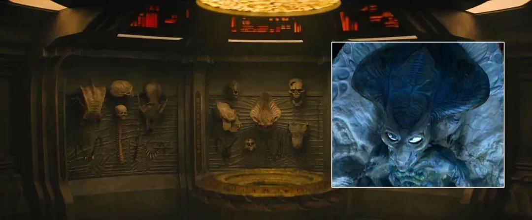 值得一提的是,在1990年的《铁血战士2》中的战利品墙上,就已经出现了异形的头颅。