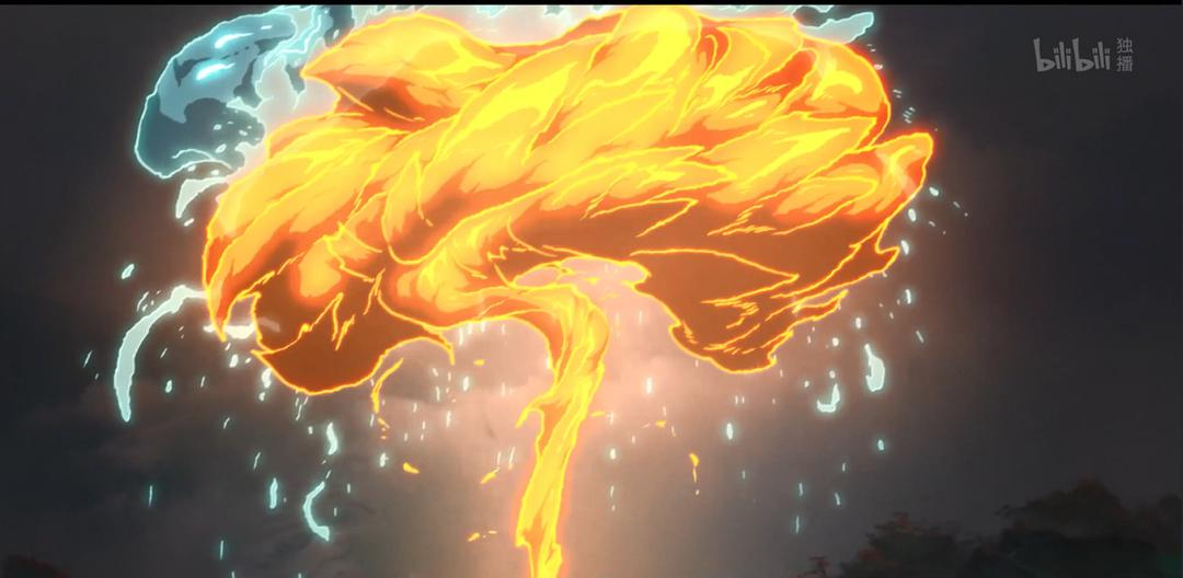 而正片中,除了场景背景沿袭第一季的水墨山水的画风,令我感到惊喜的是火行家族的闻人翊悬和水属性妖兽打斗时的场面。水与火的碰撞,变成爆发的水蒸气。画面细致地描绘了这样的情景,丝滑而绚烂,如同花开。