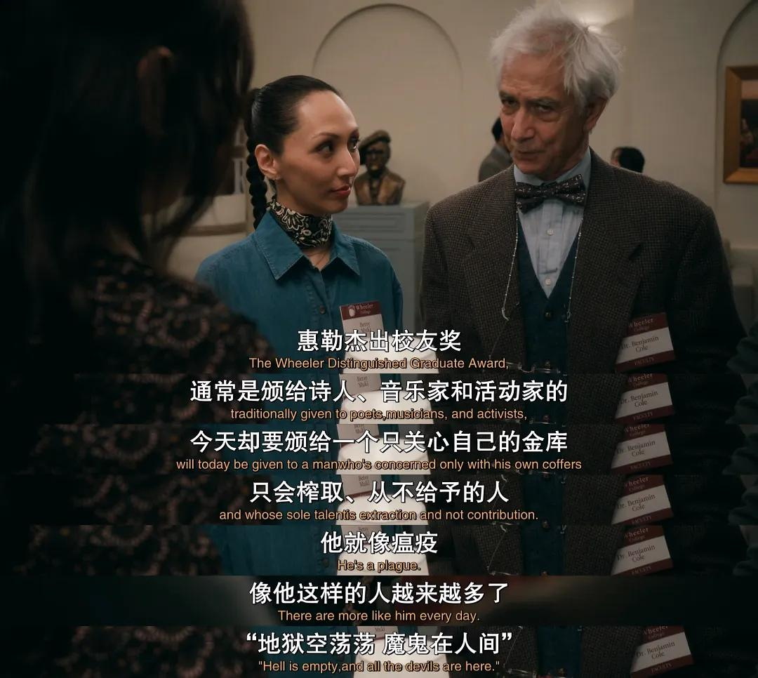 学院里不少人对这样的安排都暗自摇头,本杰明(大卫·斯特雷泽恩)说得最不客气:地狱空荡荡,魔鬼在人间。这种像瘟疫一样的资本家,凭什么得奖?