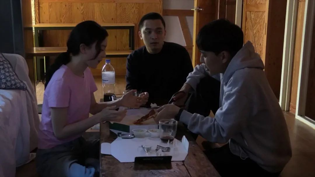 现在我们可以将目光转向洪常秀在广漠的滩涂上为我们抓取的这三位电影人。演员(在她/他所处的情境中)-被观看者、摄影师-观看者、导演-驱动观看者——三个职位的设定形成了一套最朴素的视觉系统、一架原始的观看机器,也是独立电影的骨架。而在济州岛的一周中,这三个人并不是、或不仅仅是作为个体而存在,他们之间的关系演变是时间尺度的内生变化,同时也成为影响创作的一部分材料——与作品互相依附生长的藤蔓。这个小团队似乎映照出了一种洪常秀理想中的搭档模式,成员间与其说「同事」,更像是「伙伴」的关系。三人第一次共同出现,即围坐在旅馆桌边吃披萨的场景,是片中仅有的几个清晰镜头之一。如同需要被平分三份的一块披萨,尽管在尝试维持一种平衡,但这平衡只是表现出尴尬的泾渭分明。这种温凉的距离感令我们回忆起童年时常见的一种三色雪糕,三个颜色的冰淇淋被等分装在盒子里,虽然看似被外力黏合成一体,实际却各有各的口味。