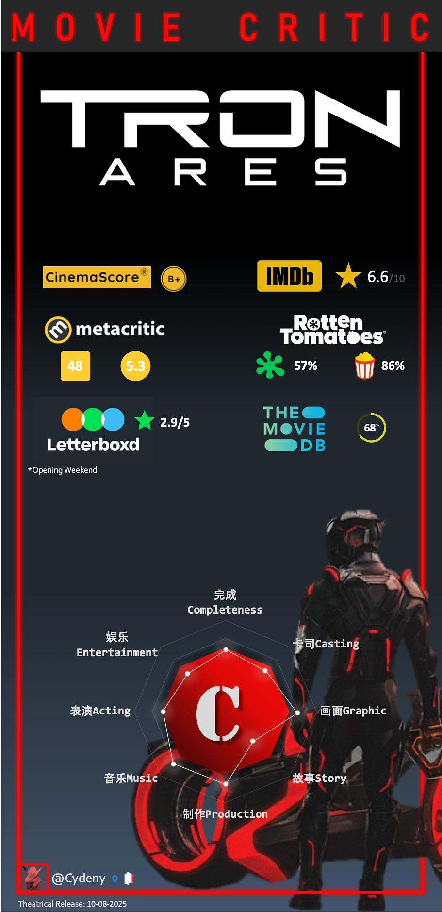 从工业逻辑上看,这又是迪士尼的老毛病:靠品牌怀旧撑场,用特效掩盖空心——尽管迪士尼暂时放弃了对减龄特效deaging的极度痴迷。前作《创:战纪》的编剧来自《迷失》及其他科幻题材,但《创:战神》的编剧杰西·威古托缺乏对科幻的基本理解,把哲学和伦理都大幅简化成视觉表演。九寸钉负责的配乐部分技术成熟但主题缺失,缺乏明确的旋律指向与叙事功能。对比《创:战纪》的 Daft Punk,只能叹一句:神话已死。