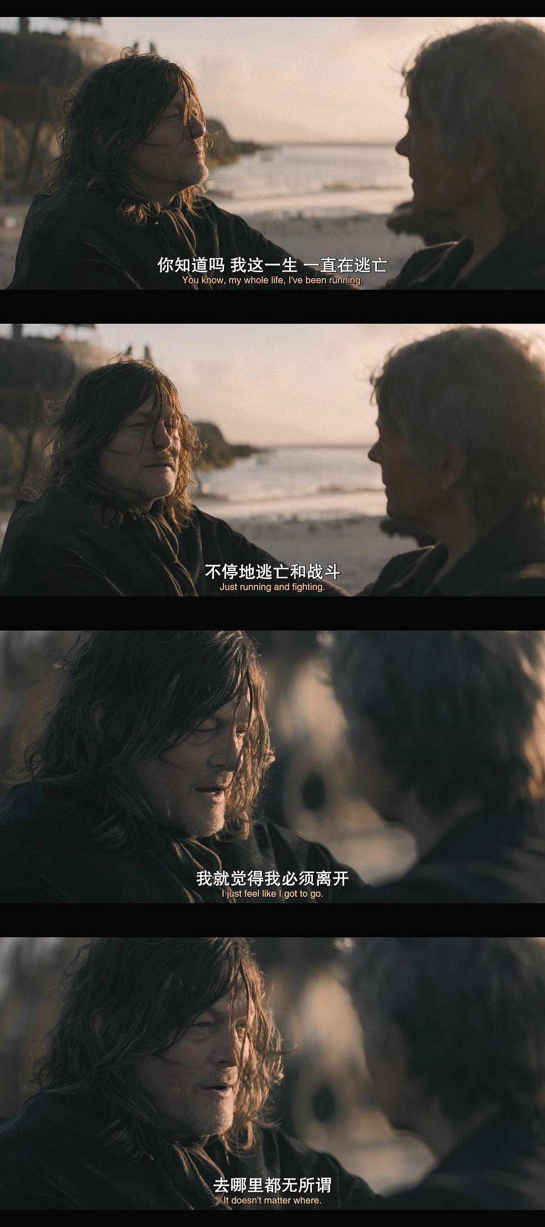 回美国的船已经修理得差不多了,近乡情更怯之下,达里尔终于对卡萝尔说出了埋藏心底的话:我这一辈子一直在逃跑、在战斗,我在一个地方根本呆不久,时间一长就得离开,去哪儿都无所谓,只要别被那个记忆中的声音追上就行…