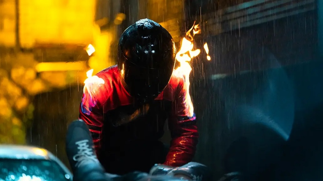 秀烈最终摔在车顶上,一副可怜兮兮的惨相。nn而K却帅气着陆,肩头着火的一幕,像极了尼古拉斯凯奇变身后,头顶着火的《恶灵骑士》。