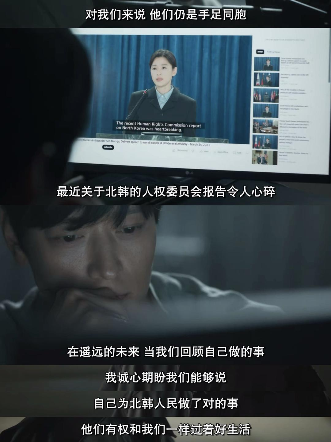 连姜栋元饰演的朝鲜特工白山湖都是因为徐闻柱作为大使对朝鲜关切的发言才密切关注她,这爱意来的非常正当且合理????